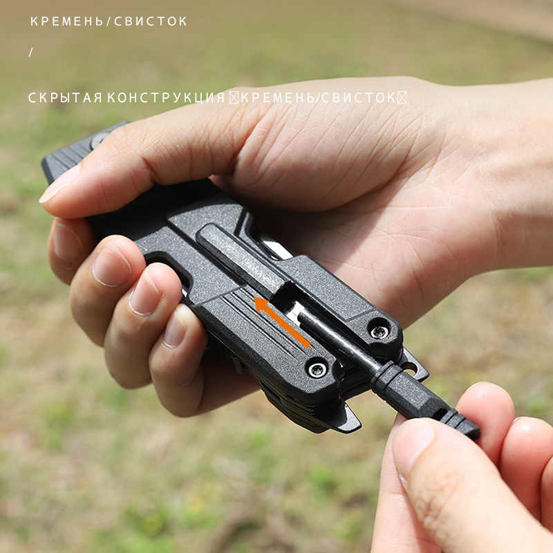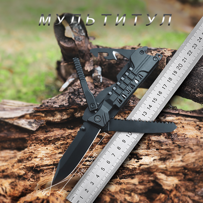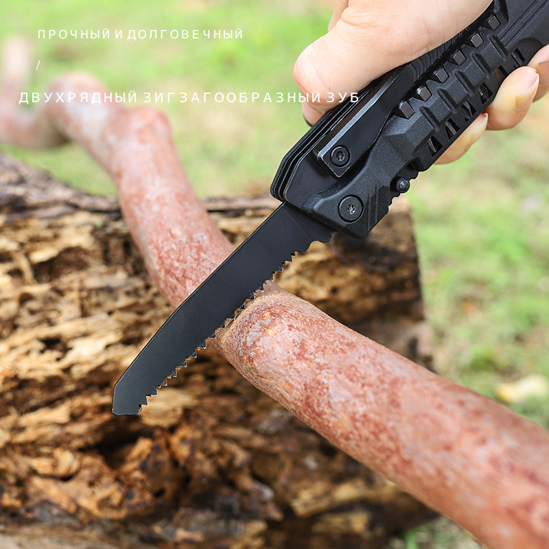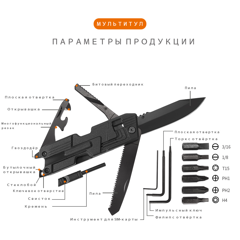 1.нож 2.Пила по дереву 3.Открывалка для бутылок 4.Открывалка для консервных банок 5. Крюк для вскрытия строп / Обрезчик верёвки 6.Аварийный свисток 7. Огниво 8. Аварийный молоток / Автостеклорез 9. Крестообразная отвёртка (также Phili ps) 10. Плоская отвёртка (также шлицевая) 11.Набор бит / Сменные биты